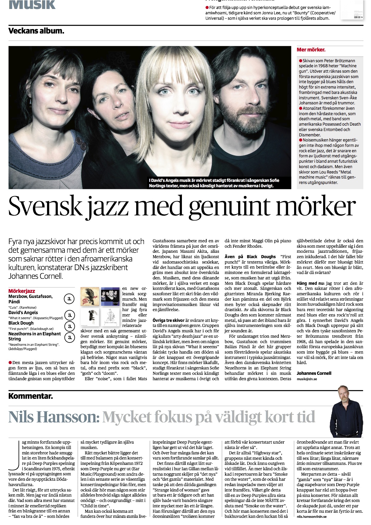 “Allerede i første nummer aner man, at de svenske herrer og den danske dame i Nezelhorns er yderst kompetente musikere….det er med følelserne uden på tøjet og et meget seriøst og inderligt udtryk….Daniel Hanson spiller legesygt og levende på både basklarinet og altsax – en sand fornøjelse at lytte på. Det er utroligt så høje toner, en saxofon kan spille i hænderne på en engageret, moderne musiker. ” -Thomas Simonsen, Aarhus Jazz Festival.